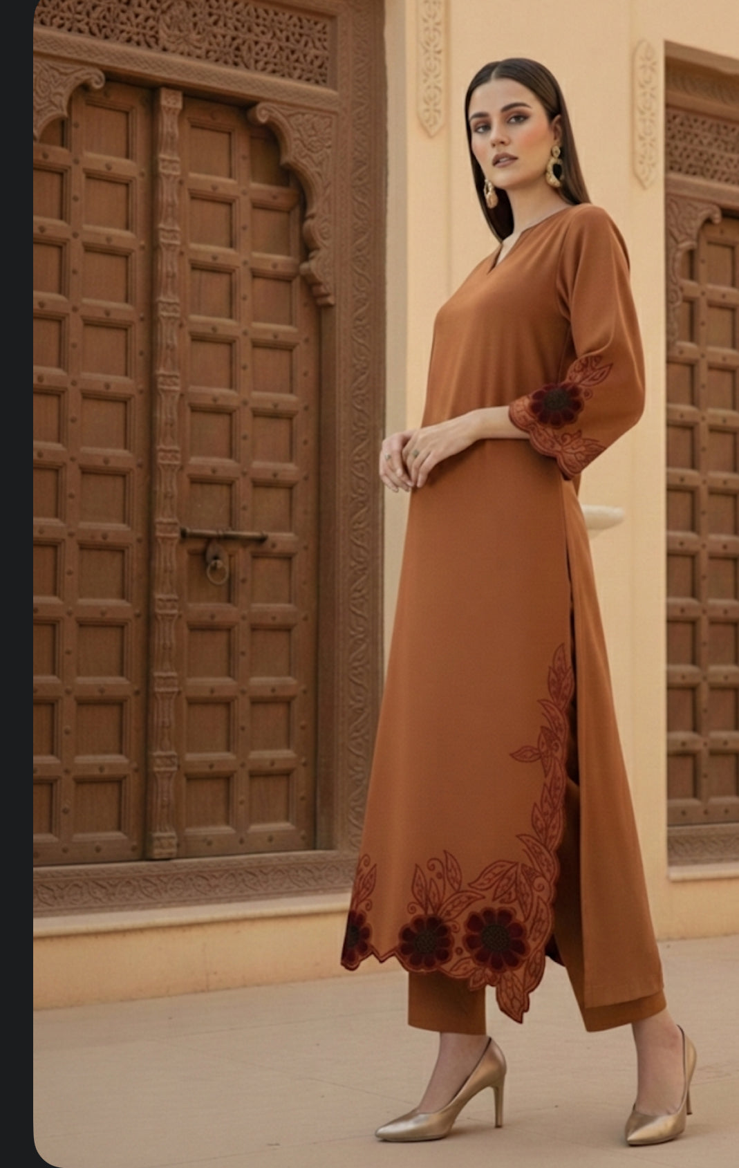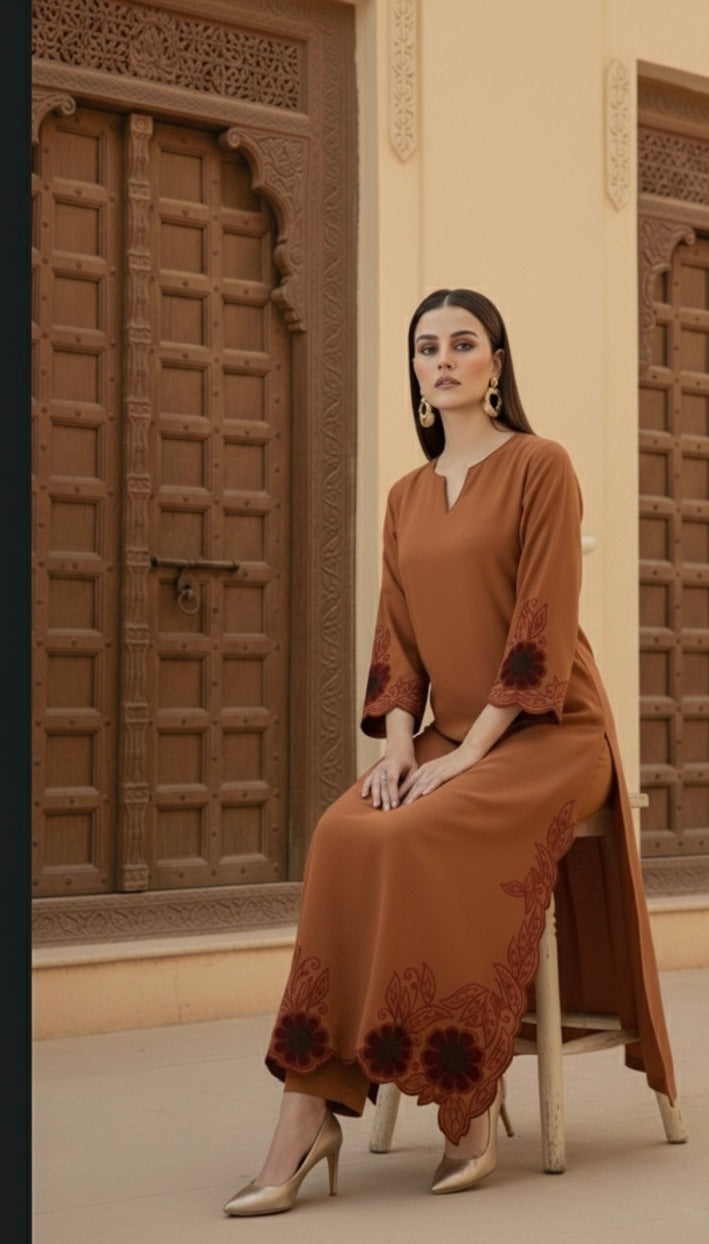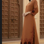 The rich earthy tone, intricate floral accents, and flowy silhouette make it perfect for intimate gatherings, festive evenings, and formal day events.