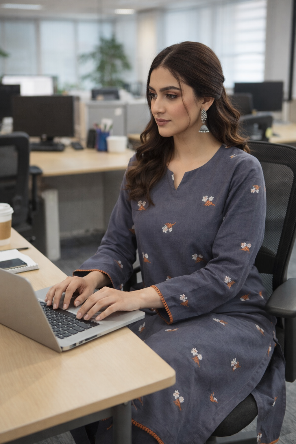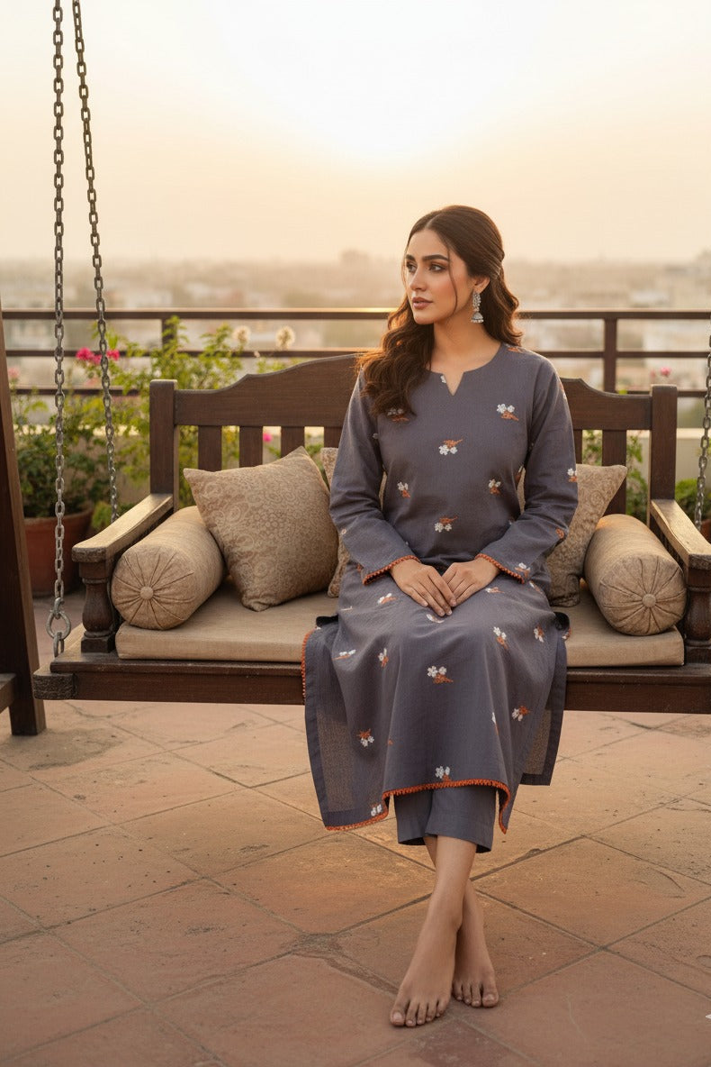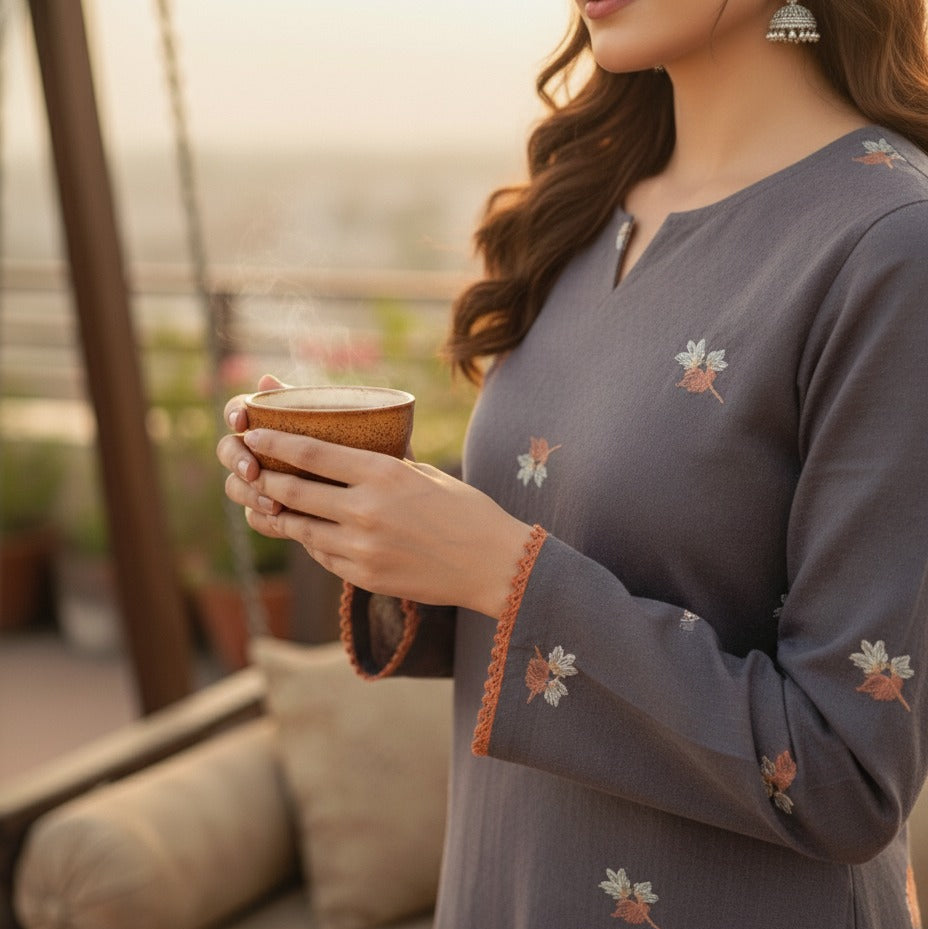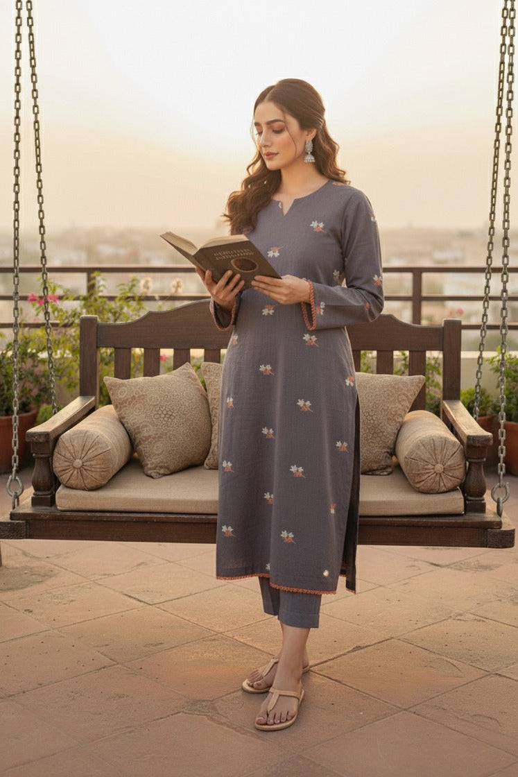 A soft grey khaddar ensemble delicately embroidered with orange and white floral sprays, paired with matching straight trousers. The neckline features subtle detailing while the orange lace edging on the sleeves adds a charming pop of color — perfectly blending warmth and elegance for the winter season.