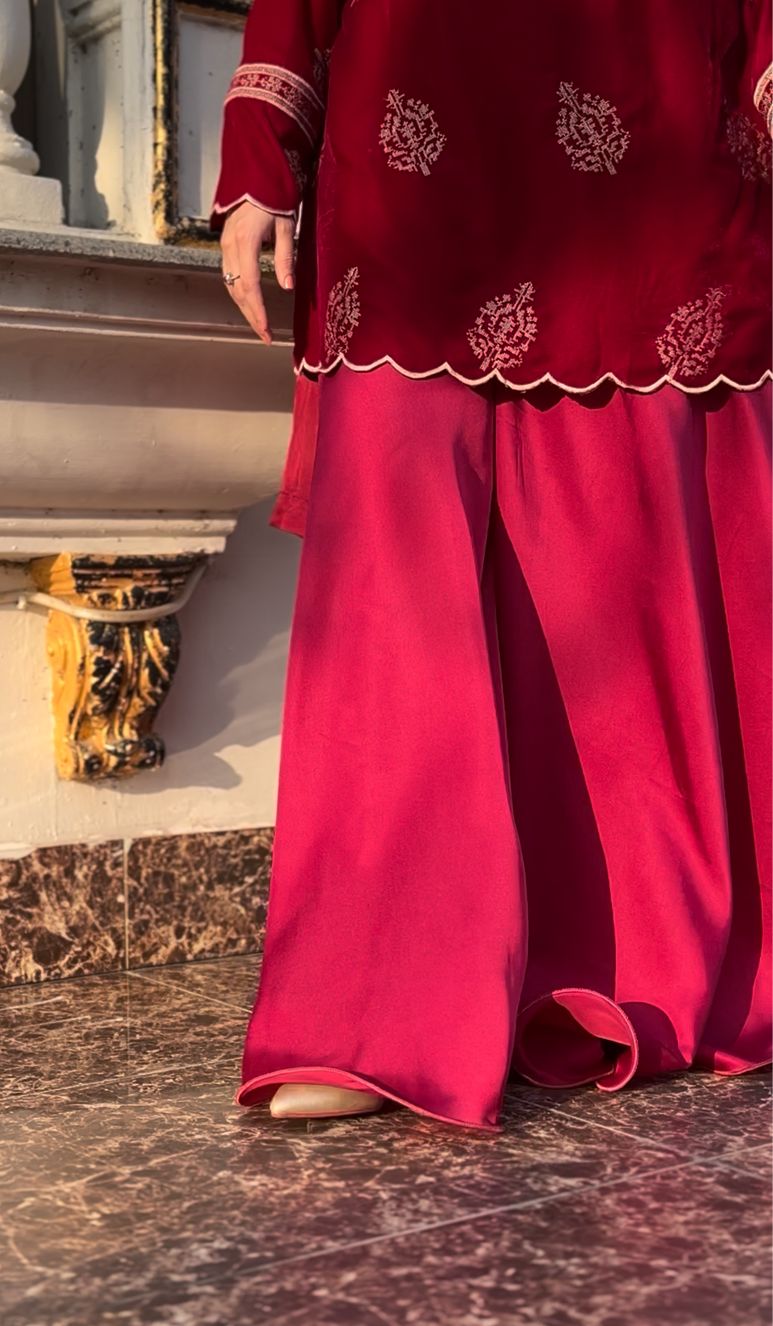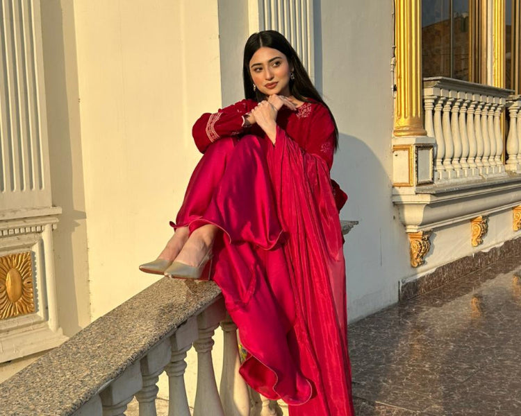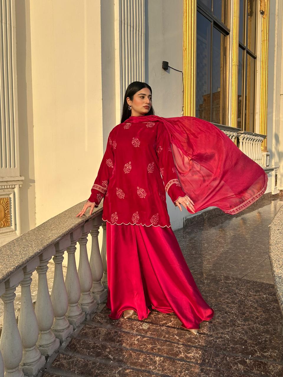 A rich crimson velvet ensemble detailed with delicate embroidery and a scalloped hemline. The flowy silhouette paired with a sheer dupatta creates a graceful, festive look — elegant yet effortlessly statement-making.