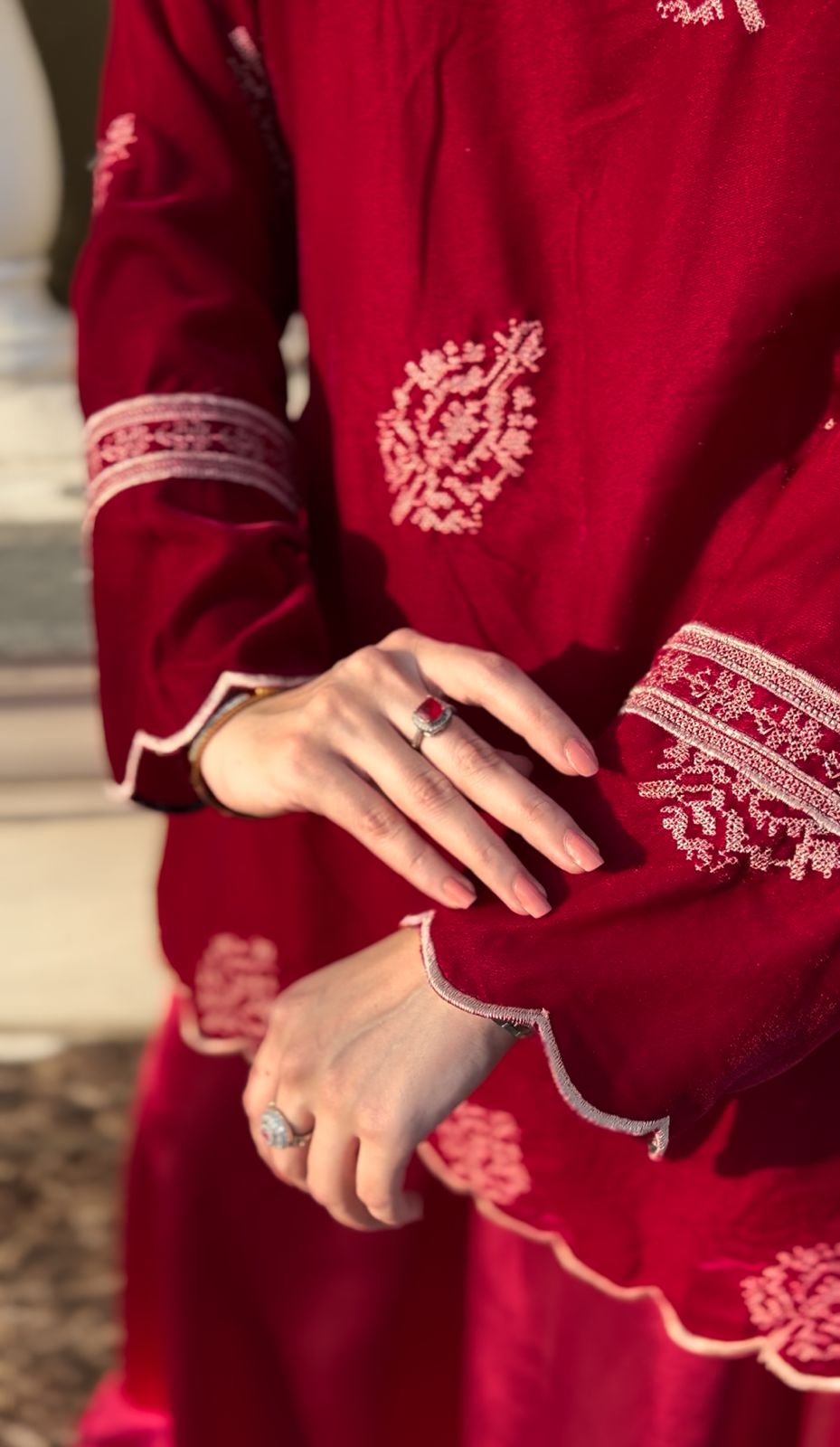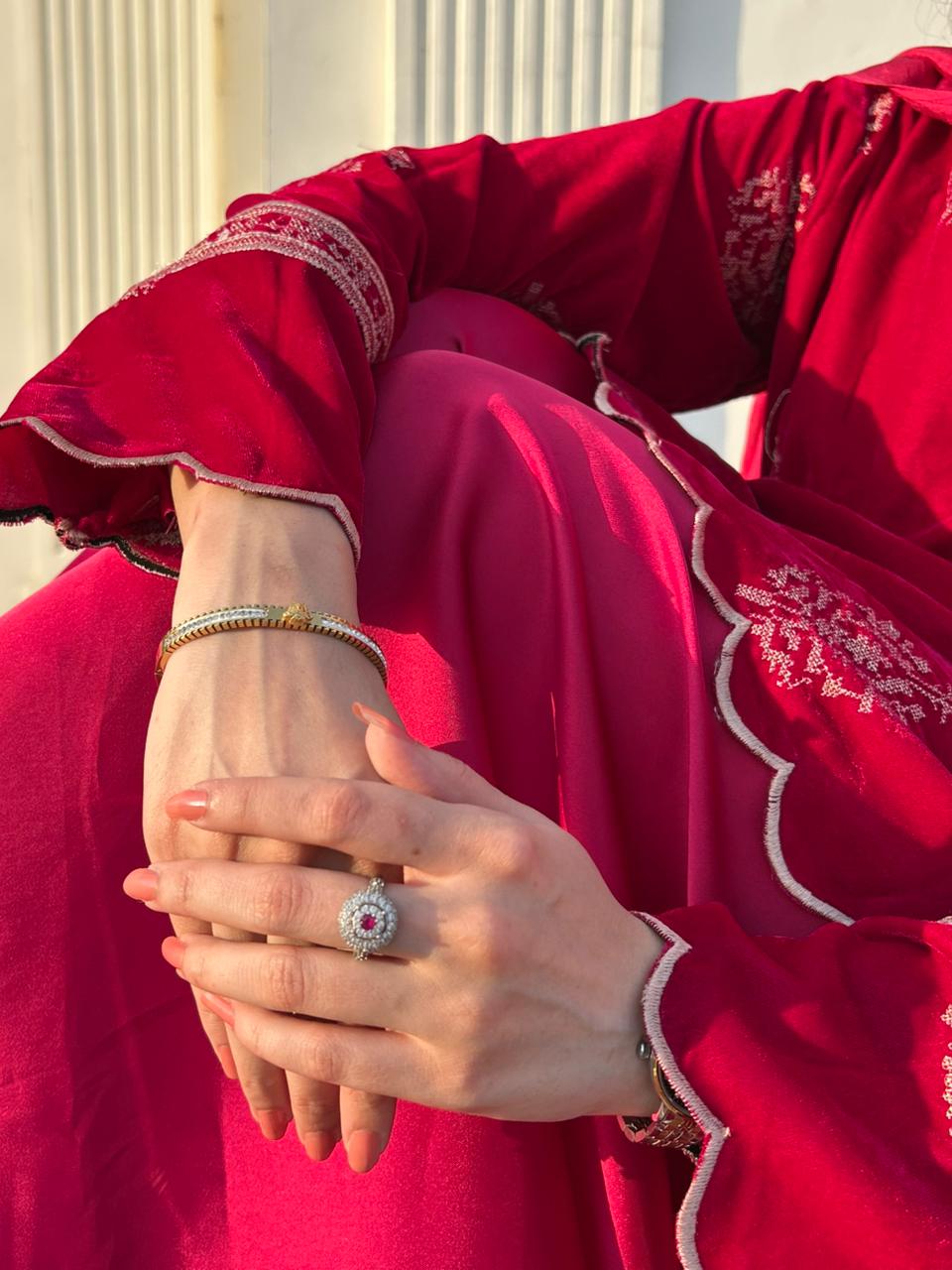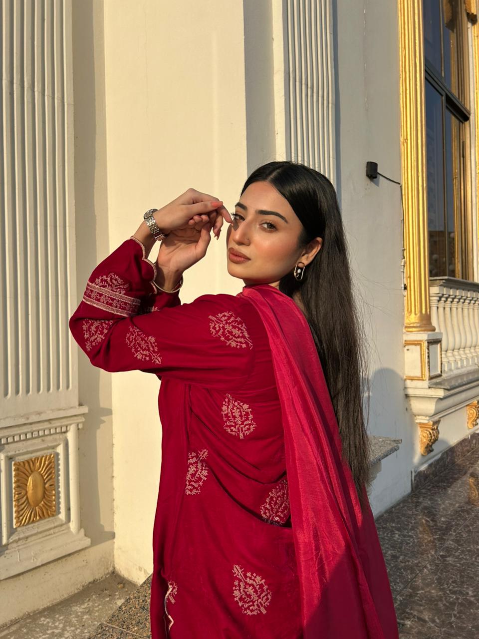 A rich crimson velvet ensemble detailed with delicate embroidery and a scalloped hemline. The flowy silhouette paired with a sheer dupatta creates a graceful, festive look — elegant yet effortlessly statement-making.