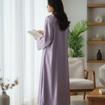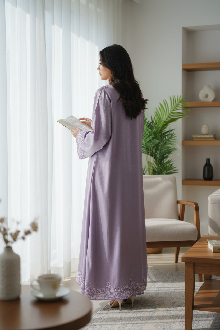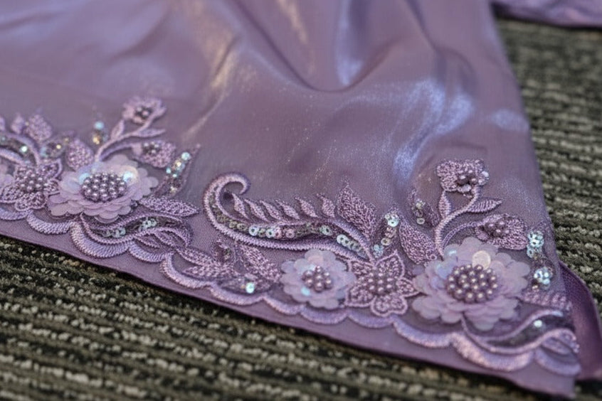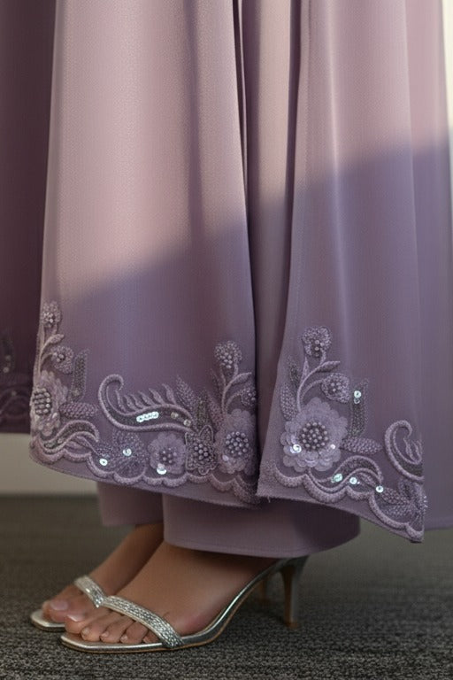 A sophisticated ready-to-wear ensemble crafted on custom demand, featuring a long A-line shirt adorned with elegant patchwork detailing on the neckline, sleeves, and hemline only front embroided. Paired with a plain raw silk dupatta and sleek sheesha silk trousers, this outfit blends timeless craftsmanship with contemporary grace — a refined choice for those who appreciate bespoke elegance.